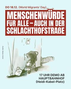 Am Donnerstag den 18.12 dem International Migrants Day möchten wir gemeinsam für Würde und Solidarität für alle - auch in der Schlachthofstraße - auf die Straße gehen.