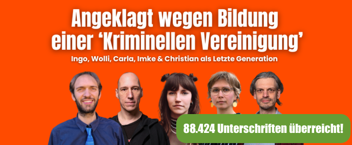 Wir informieren über die laufenden Verfahren wegen Bildung einer kriminellen Vereinigung (§129 StGB) gegen Unterstützer*innen der Letzten Generation und lenken dabei die Aufmerksamkeit auf die gravierenden Folgen für zivilgesellschaftliches Engagement. Außerdem schaffen wir Möglichkeiten, gegen diese Kriminalisierung und Einschränkung von Grundrechten aktiv zu werden.