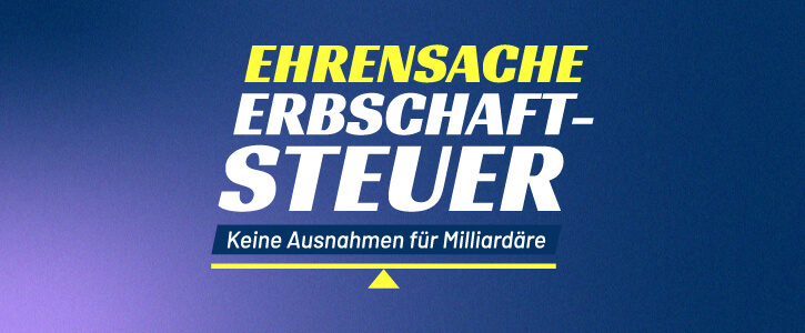 Wir fordern eine verfassungskonforme, privilegienfreie Erbschaftsteuer. Unser Ziel: Alle sollen einen gerechten Beitrag zum Gemeinwesen leisten. Dafür müssen große Erbschaften, auch von Unternehmensvermögen, so besteuert werden wie alle anderen. Milliardärsfamilien dürfen sich nicht länger ihrer gesellschaftlichen Verantwortung entziehen. Die Zahlung der Erbschaftsteuer sollte Ehrensache sein.