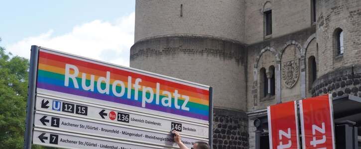 Das Regenbogenschild am Rudolfplatz soll "bis auf Weiteres" hängen bleiben. Das ist eine schöne Nachricht und ein starkes Zeichen für Sichtbarkeit und Vielfalt.