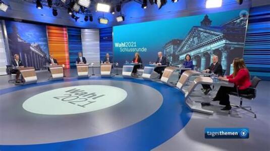Tina Hassel, Leiterin des ARD-Hauptstadtstudios, und Theo Koll, Leiter des ZDF-Hauptstadtstudios, moderieren die Schlussrunde, an der Armin Laschet (CDU), Olaf Scholz (SPD), Alice Weidel (AfD), Christian Lindner (FDP), Janine Wissler (Die Linke), Annalena Baerbock (Bündnis 90/Die Grünen) und Markus Söder (CSU) teilnehmen.