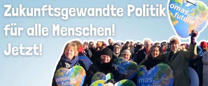 Wir, die Omas und Opas for Future, fordern die zukünftige Bundesregierung und alle demokratischen Parteien auf, das Wohl der Menschen und die Bewahrung ihrer Lebensgrundlagen in den Fokus ihrer Politik zu stellen!