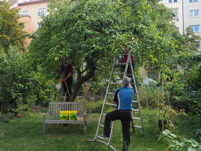 Auf den rund 2400 m2 des Blocks 4 werden wie schon in den Notzeiten des Krieges Bio-Obst und -Gemüse angebaut, allein dieses Jahr wurden 80 kg Pflaumen einer Obdachloseneinrichtung zur Verfügung gestellt. Die Gärten mit ihren offenen Wegen sind auch ein wohltuender, kühlender Ort des Durchatmens im Klimastress für die gesamte Nachbarschaft, ein vielfältiger, schöner Lebensraum für Pflanzen und Tiere und damit ein Ort der Naturerfahrung und Umweltbildung, ein Ort, an dem Regenwasser versickern kann, ein Ort, dessen engagierte Gärtnerinnen und Gärtner bei bürgerwissenschaftlichen Projekten zum Klimawandel mitmachen und die Nachbarschaft daran teilhaben lassen. Hier finden auch seltene Tiere und Pflanzen ein Zuhause: Nashornkäfer, verschiedene Wildbienenarten, Grauspecht, Fledermäuse, Feld Rittersporn, wilde Tulpen. Eine große Spatzen-WG wirbelt durch alle Gärten, Stare, Amseln, Rotkehlchen und viele andere ziehen hier jährlich ihre Jungen in den Hecken groß. Eine Fuchsfamilie kommt oft in den Abendstunden oder nutzt schon tagsüber die Hochbeete für ein Sonnenbad. Drei Bienenvölker bestäuben die vielen alten Obstbäume.