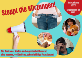 Stoppt die Kürzung der Gelder für die Pankower Offene Kinder- und JugendarbeitIch habe die 2.981 Unterschriften an Bezirksbürgermeisterin Dr. Cordelia Koch und den jugendpolitischen Sprecher der Partei Bündnis 90/Grünen Karsten Gloger übergeben - mit Erfolg! Die Pankower Politiker*innen haben die Kürzung zurückgenommen und die fehlenden Beträge zum Erhalt des Status Quo nachträglich sowohl für 2024 als auch 2025 eingestellt. Danke an alle!2.978 UnterschriftenGestartet von Jana Ringer
