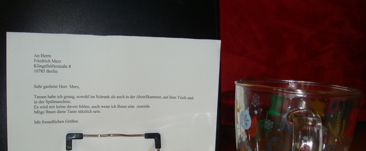 Bitte, Herr Merz, gehen Sie mit diesen Spenden verantwortungsbewusst und respektvoll um, auch wenn es sich bei diesen nur um Tassen, vorwiegend von geringem Wert, handelt. Respektieren Sie die Spender*innen.