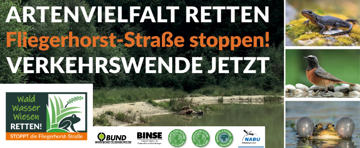 Die Stadt Oldenburg plant den Bau einer "Entlastungsstraße" für ein neues Wohn- und Gewerbegebiet auf dem Fliegerhorst, über den schon ende September im Stadtrat entschieden werden könnte. Diese Straße durchschneidet Wald, Wiesen und Feuchtbiotope in Wechloy und bedroht eines der wichtigsten Amphibienvorkommen im Nordwesten. Bodenversiegelung und die Förderung des Autoverkehrs, die dieses Bauprojekt mit sich bringt, bewirken alles andere als den so dringend benötigten Klimaschutz.
